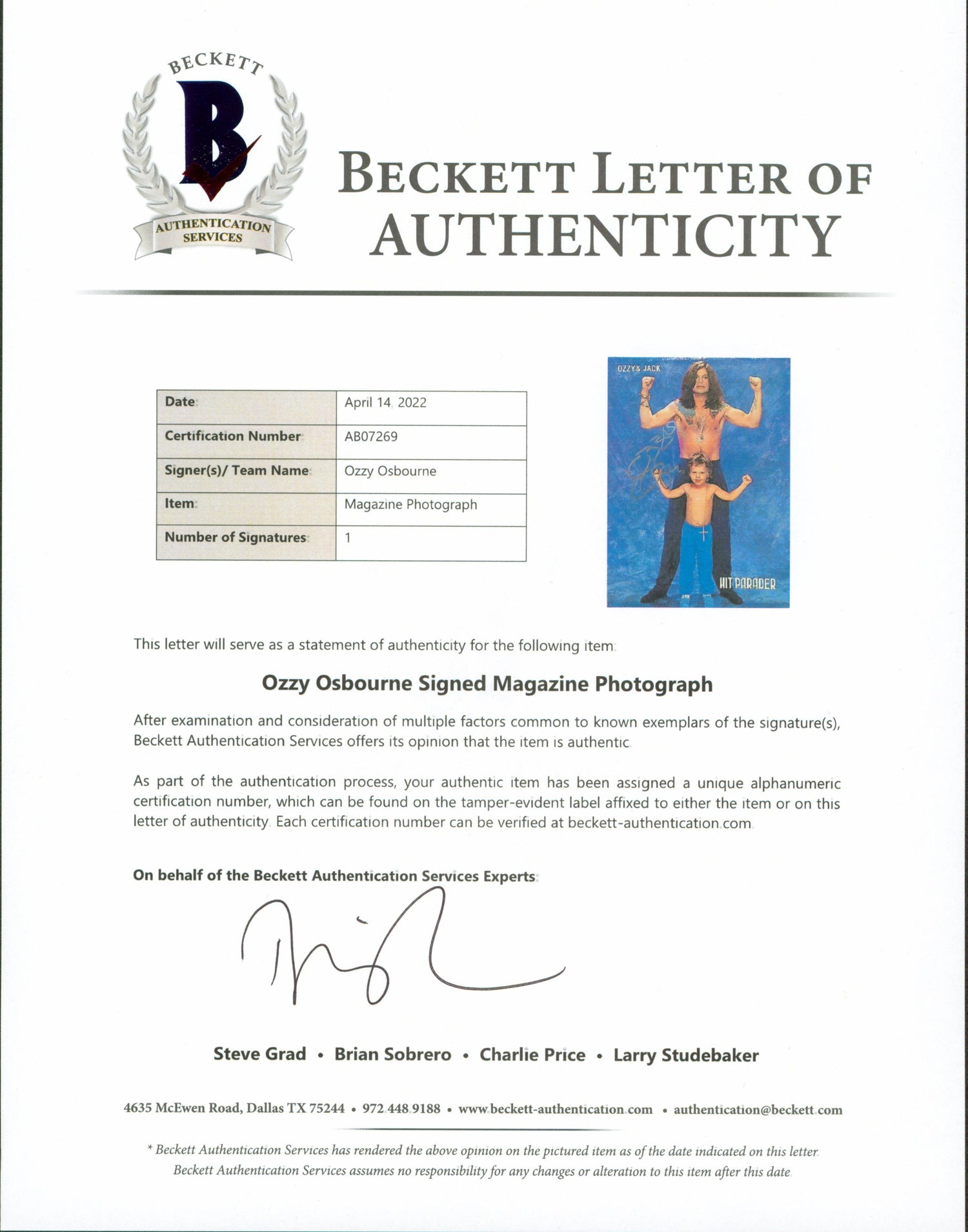 Own a legendary piece of rock history with this Ozzy Osbourne Signed 8x10.75 Hit Parader Magazine Page. A must-have for any Black Sabbath fan or music memorabilia collector, this autographed magazine page captures the essence of one of rock’s most iconic frontmen.