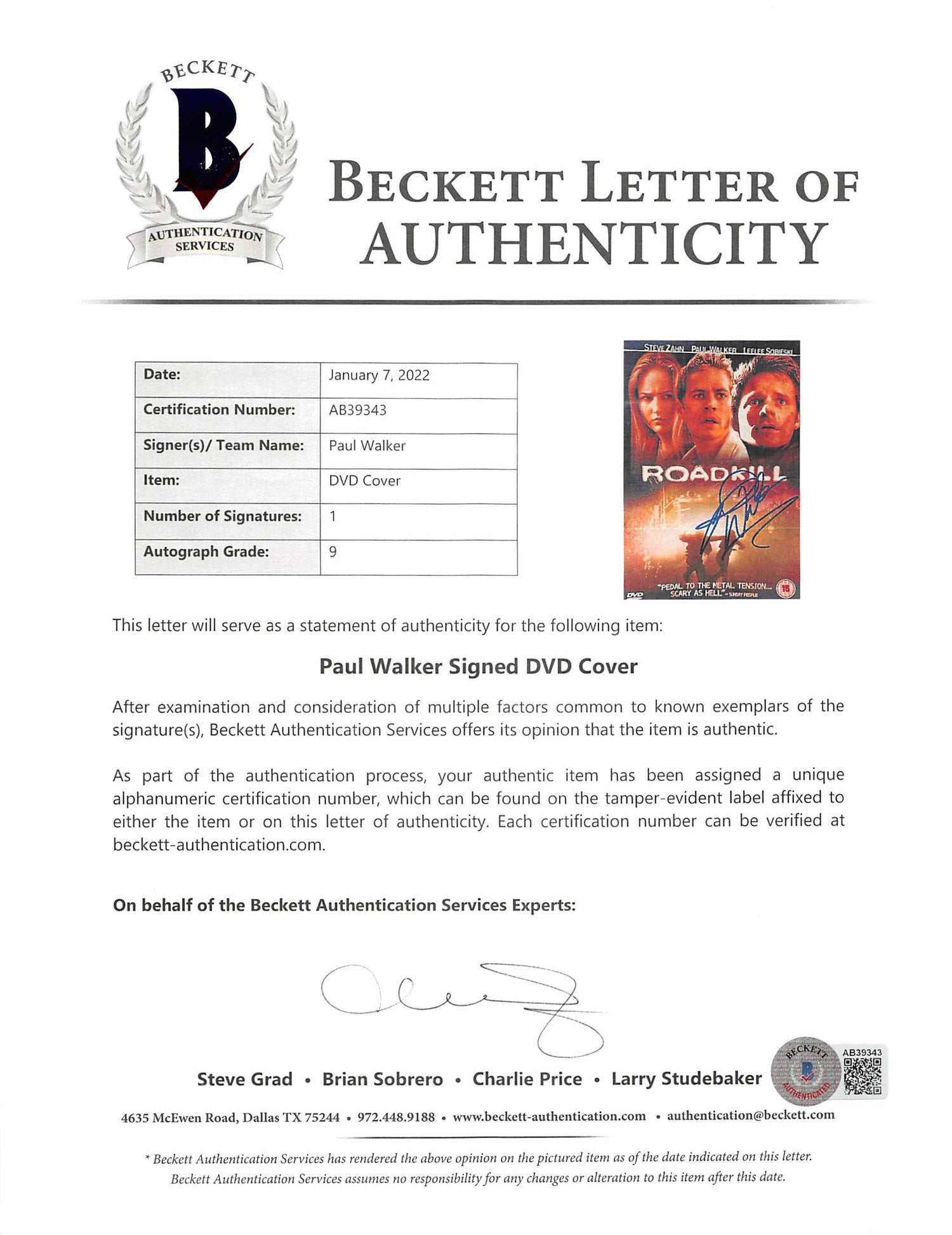 Paul Walker Authentic Signed Roadkill DVD Cover Auto Graded Mint 9! BAS #AB39343 is backordered and will ship as soon as it is back in stock.