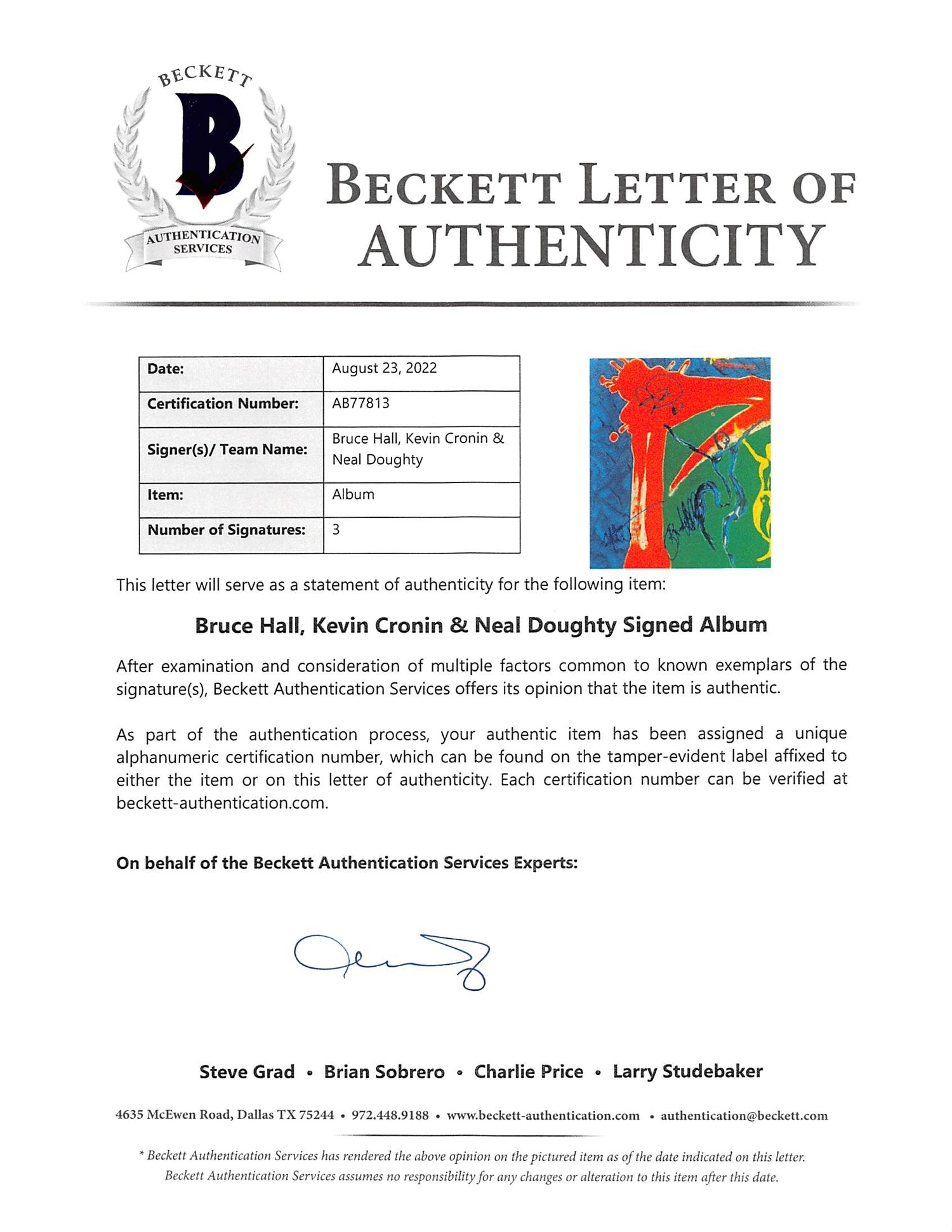 - Personally Signed by REO Speedwagon members Bruce Hall, Kevin Cronin, and Neal Doughty.