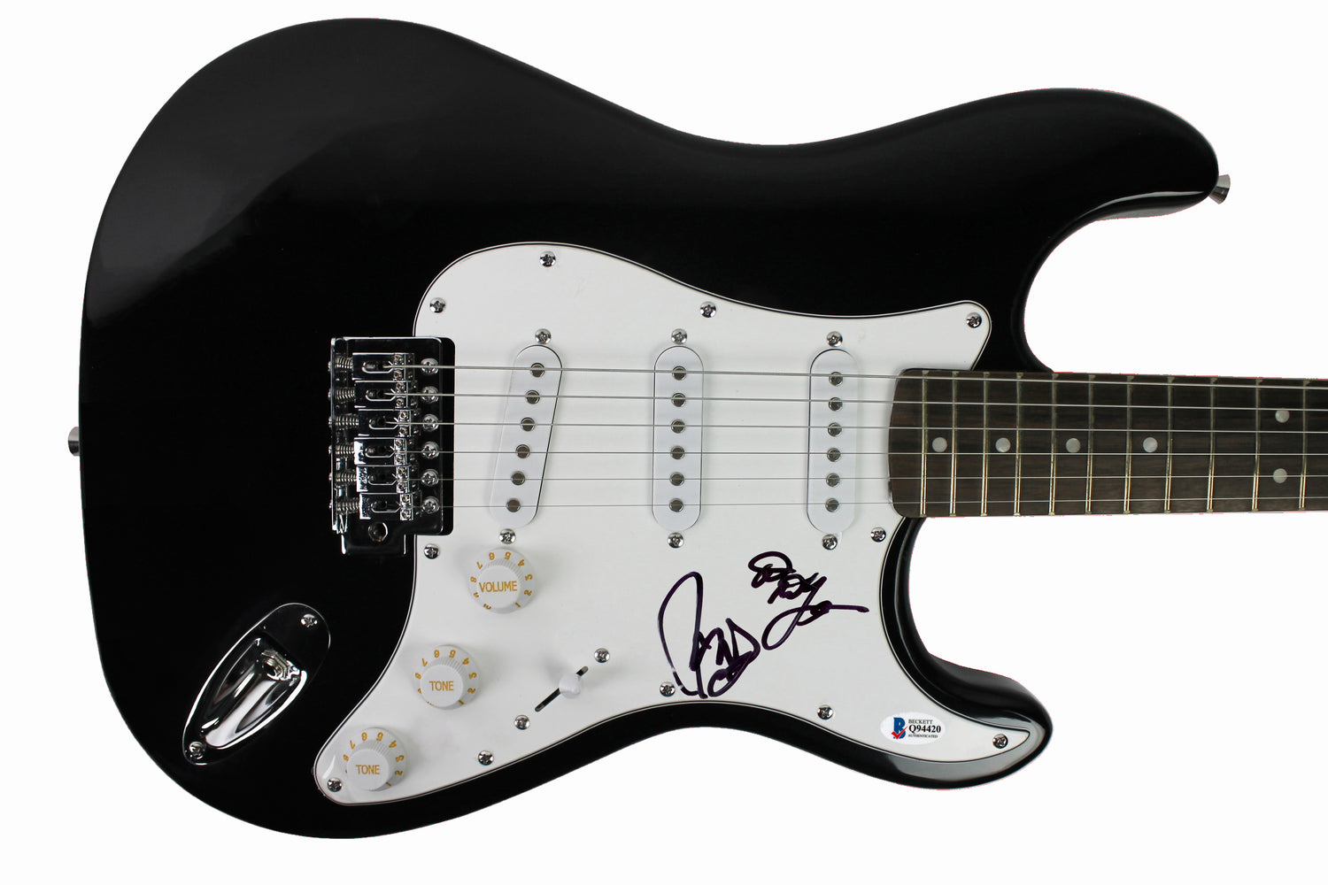 - Black electric guitar featuring authentic autographs on the body