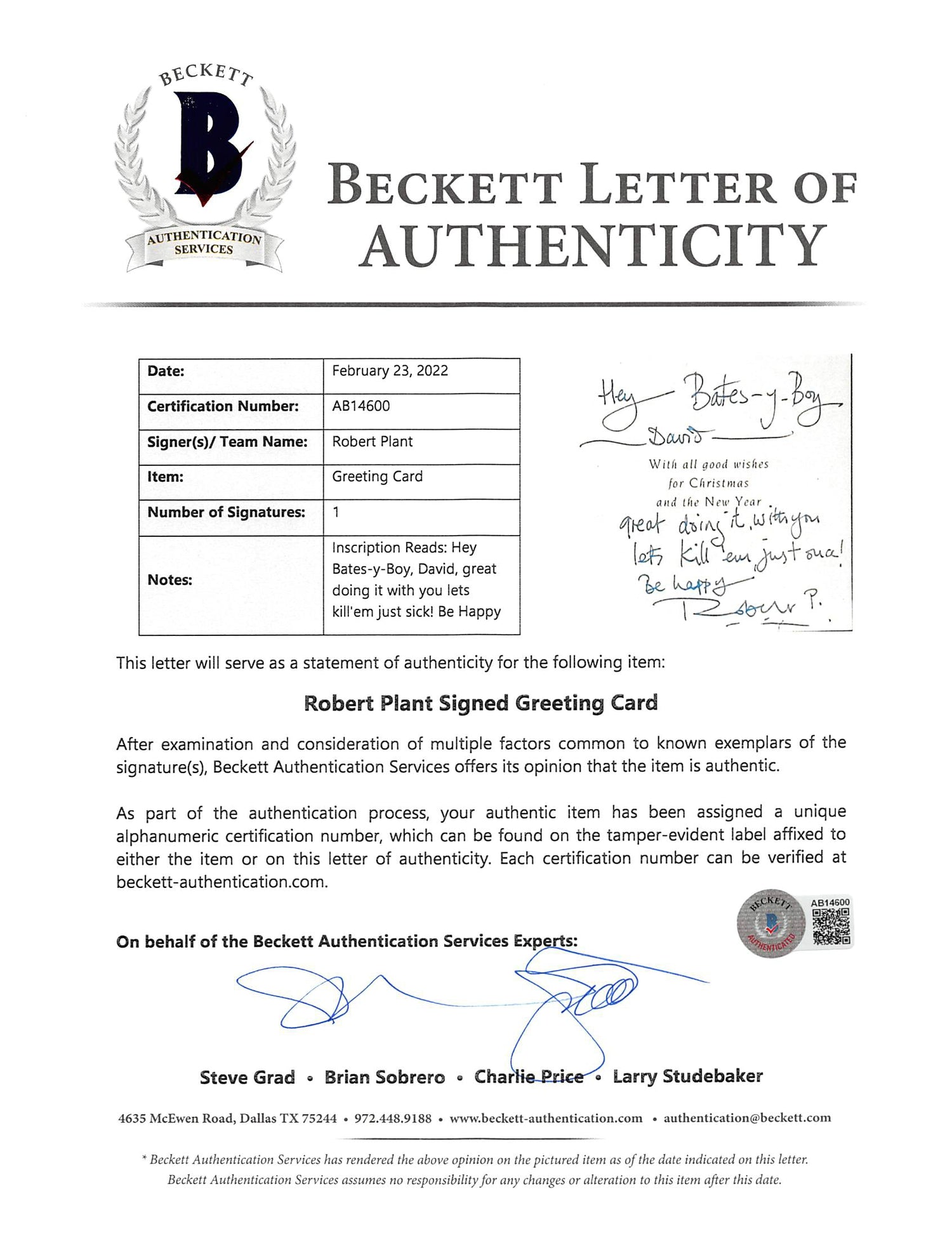 Robert Plant Led Zeppelin Signed 4x8.15 Christmas Greeting Card BAS #AB14600 is backordered and will ship as soon as it is back in stock.