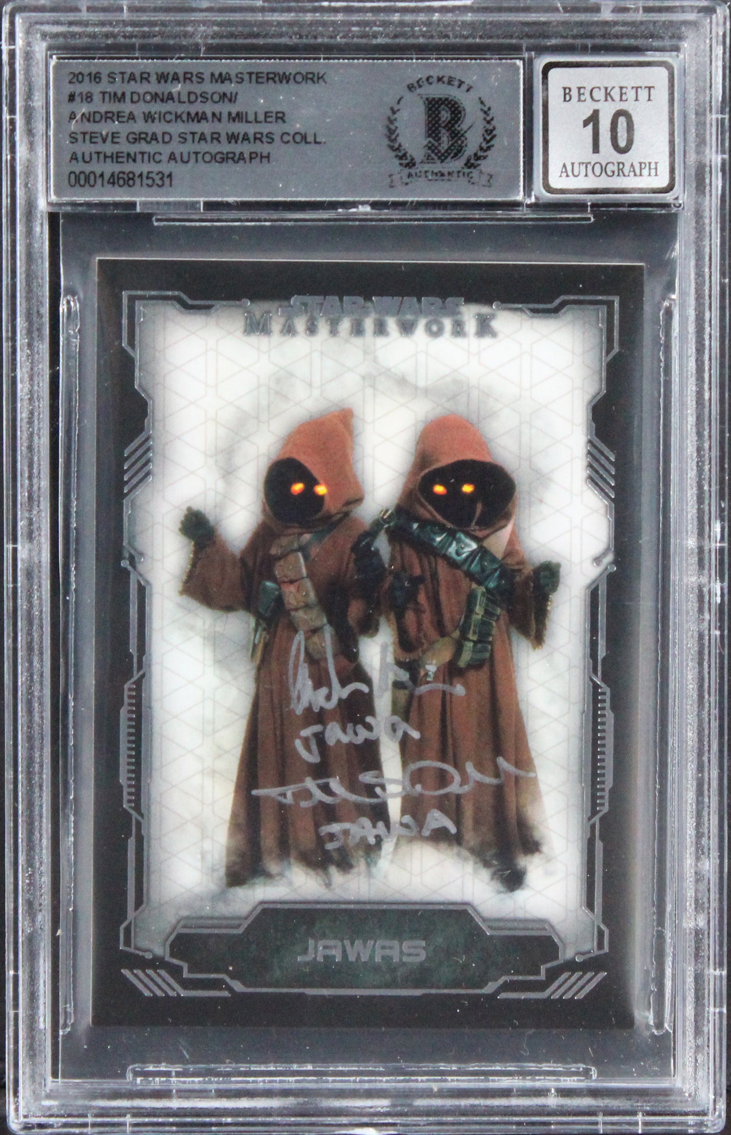 This Autographed 2016 Star Wars Masterwork #18 Auto Graded Gem Mint 10! Card is a must-have for any serious Star Wars memorabilia collector. Featuring authentic signatures from Tim Donaldson and Andrea Wickman Miller—who both portrayed iconic Jawa characters in the original Star Wars film—this collectible captures a piece of cinematic history from one of the most beloved sci-fi franchises of all time. Professionally slabbed and authenticated by Beckett Authentication Services (BAS), this card includes the unique inscription "Jawa 2x", a nod to the dual portrayal that makes this item especially rare and desirable. This pristine card has received a Gem Mint 10 grade for its autograph, representing the highest standard in authentication and condition. Whether you're a lifelong Star Wars fan or an dedicated autograph collector, this signed card offers exceptional value and a unique story straight from the galaxy far, far away.