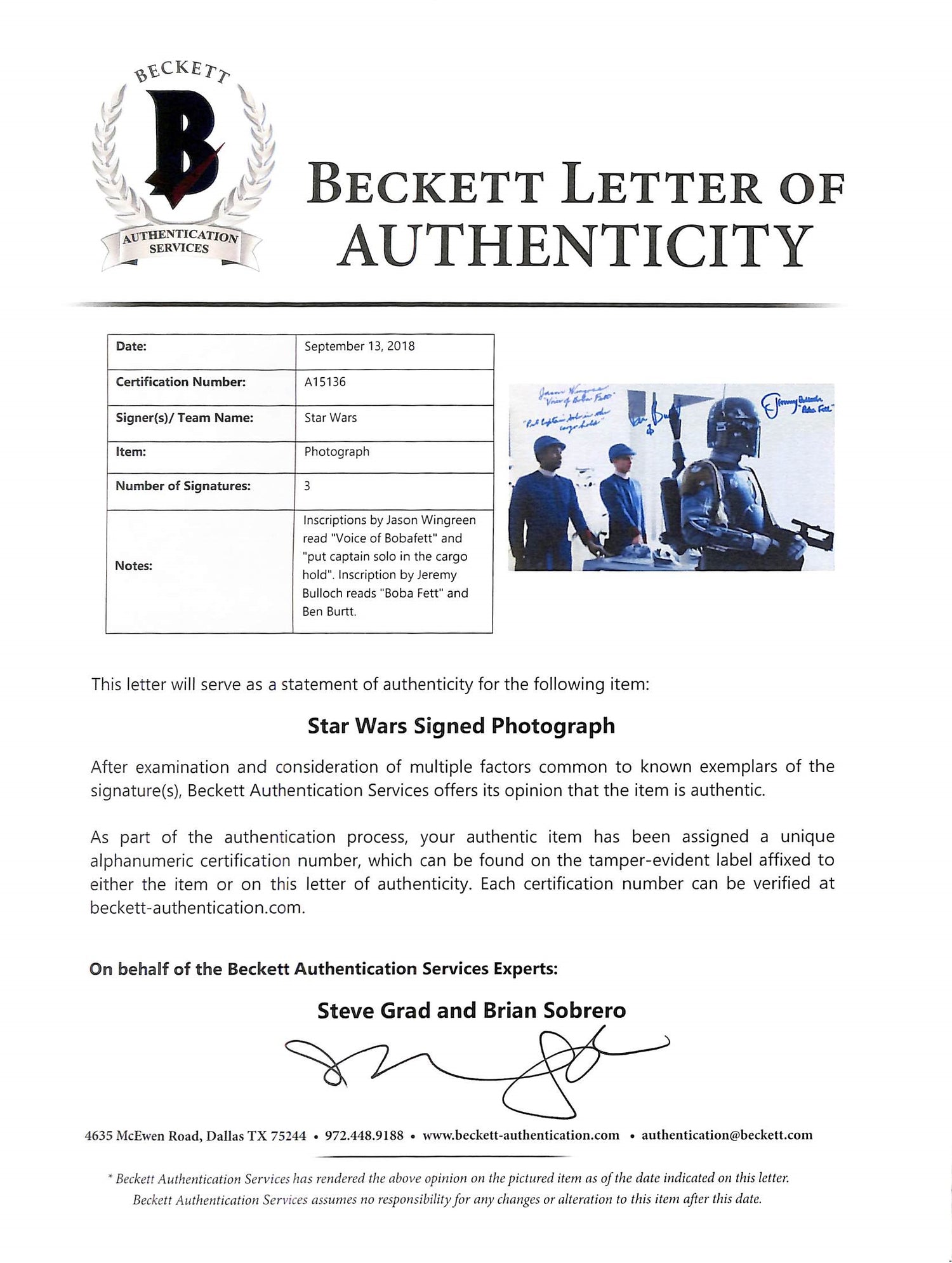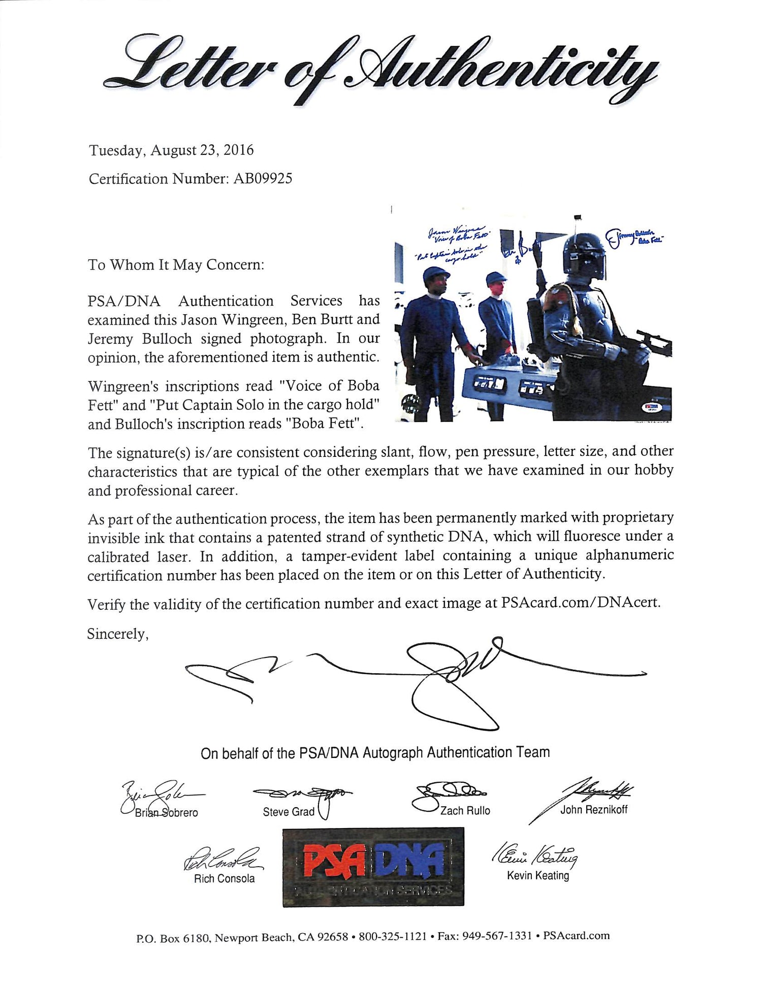 - Officially Autographed by Jason Wingreen (Voice of Boba Fett), Jeremy Bulloch (Boba Fett Actor), and Ben Burtt (Sound Designer)