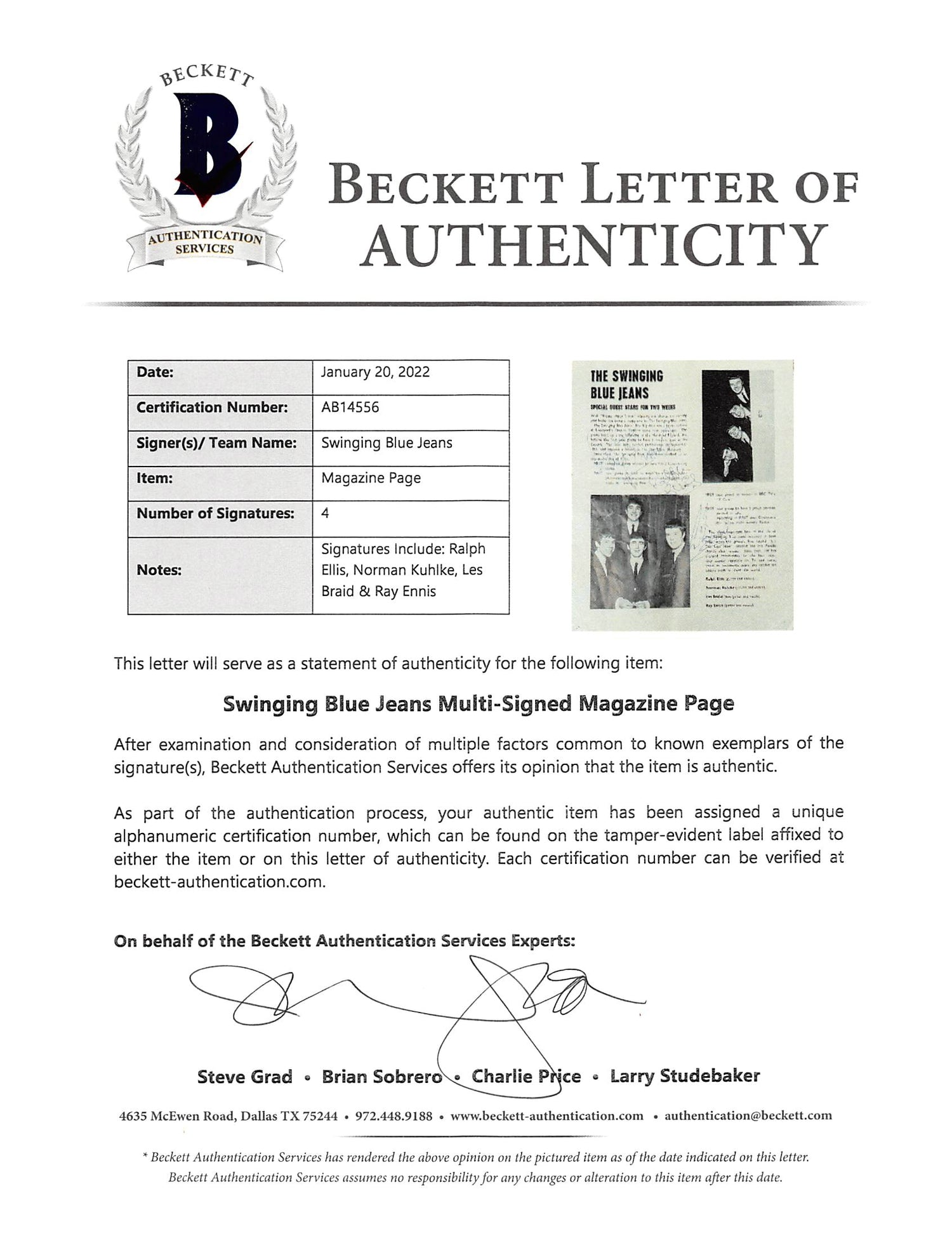 Swinging Blue Jeans (4) Ellis, Kuhlke, Braid & Ennis Signed Magazine Page BAS is backordered and will ship as soon as it is back in stock.
