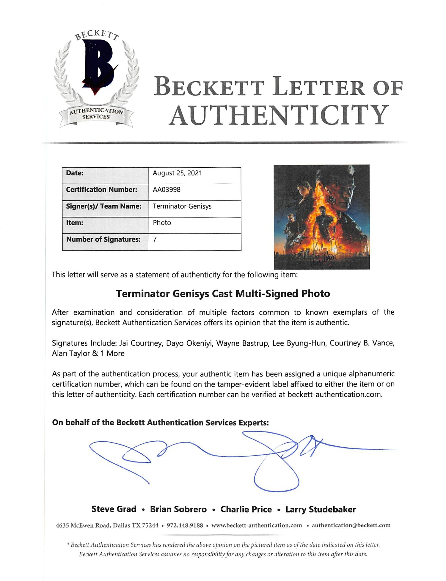 Terminator Genisys (7) Courtney, Okeniyi, Bastup Signed 11x14 Photo BAS #AA03998 is backordered and will ship as soon as it is back in stock.