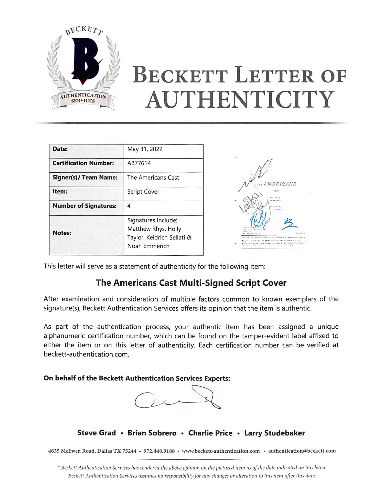 The Americans (4) Rhys, Taylor, Sellati +1 Signed Script Cover BAS #AB77614 is backordered and will ship as soon as it is back in stock.