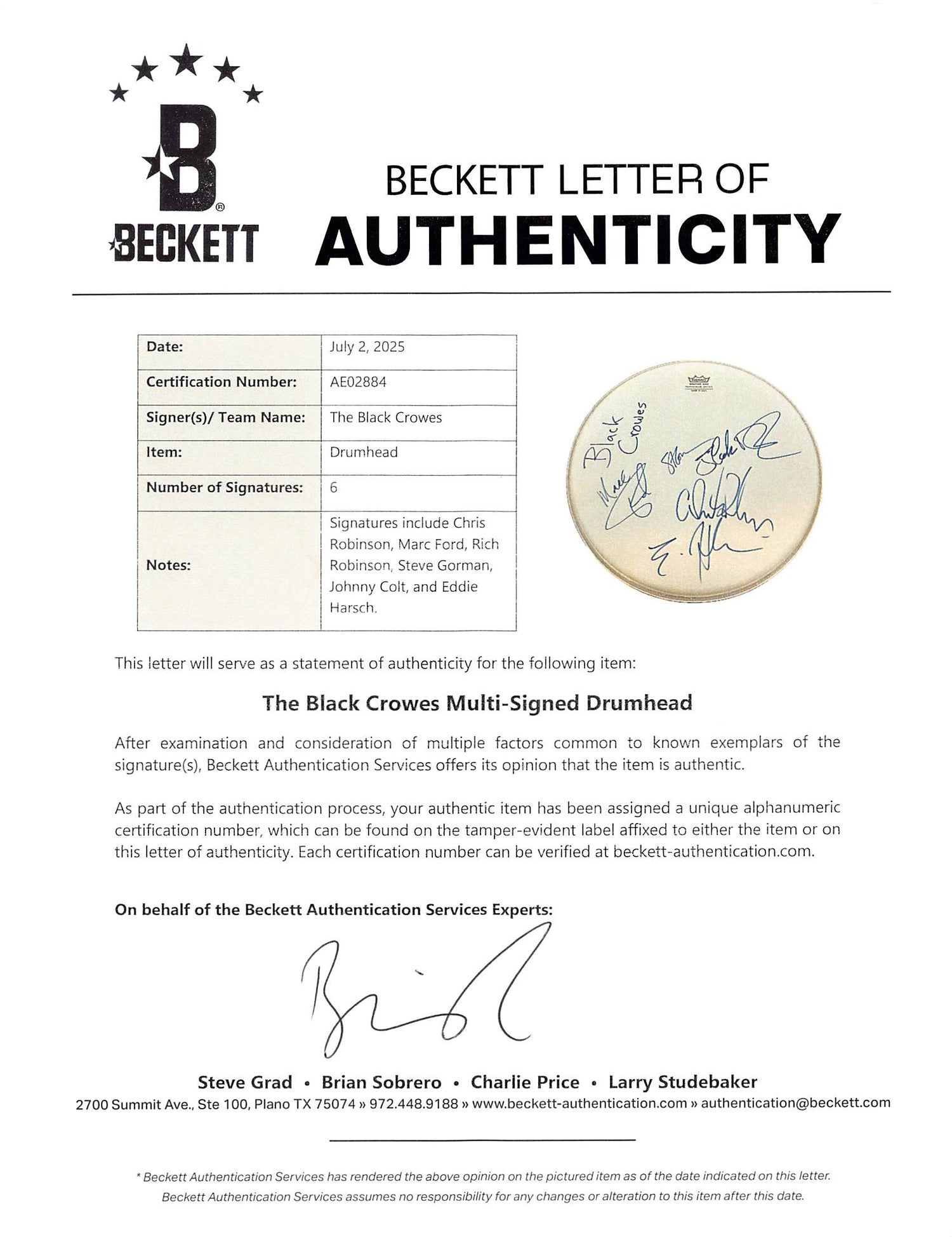 This signed 13-inch Remo drum head is a must-have collectible for any devoted fan of 1990s rock and American music history. Personally autographed by all six original members of The Black Crowes—Chris Robinson, Marc Ford, Rich Robinson, Steve Gorman, Johnny Colt, and Eddie Harsch—this rare piece captures the essence of the band behind chart-topping hits like “She Talks to Angels” and “Hard to Handle.” Whether you're a seasoned memorabilia collector or a passionate music lover, this authentic item brings you closer to one of Southern rock's most influential bands.