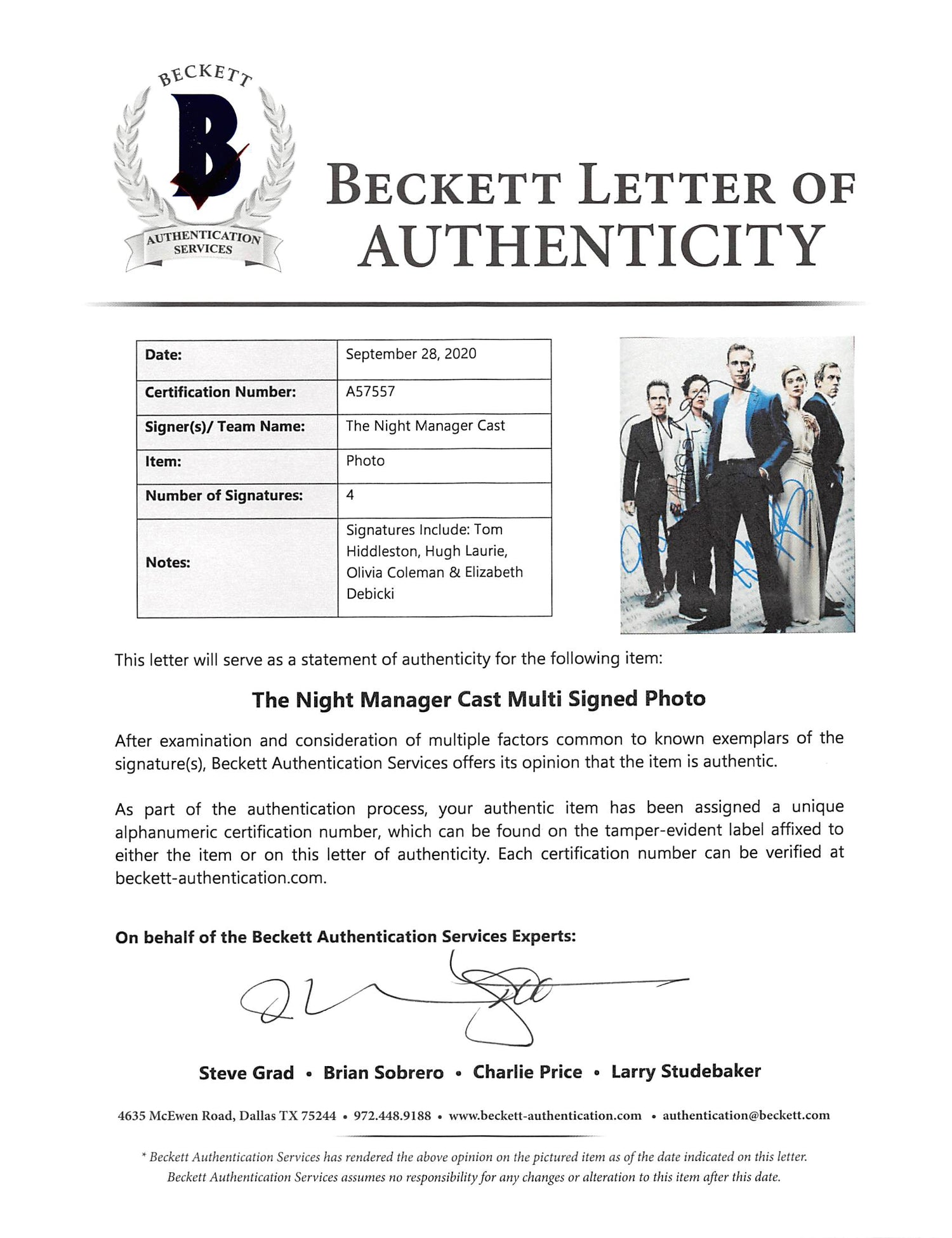 The Night Manager (4) Hiddleston, Laurie +2 Signed 11x14 Photo BAS #A57557 is backordered and will ship as soon as it is back in stock.
