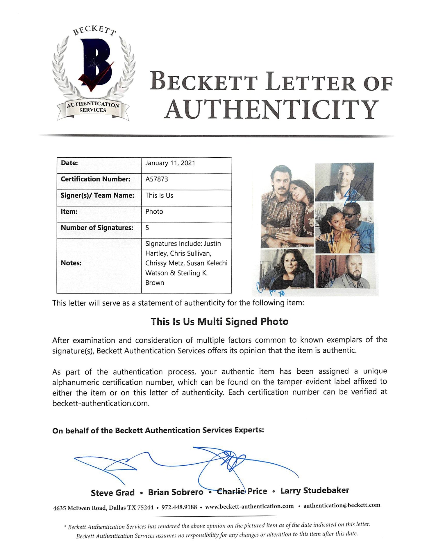 This Is Us (5) Hartley, Sullivan, Metz, Brown +1 Signed 11x14 Photo BAS #A57873 is backordered and will ship as soon as it is back in stock.