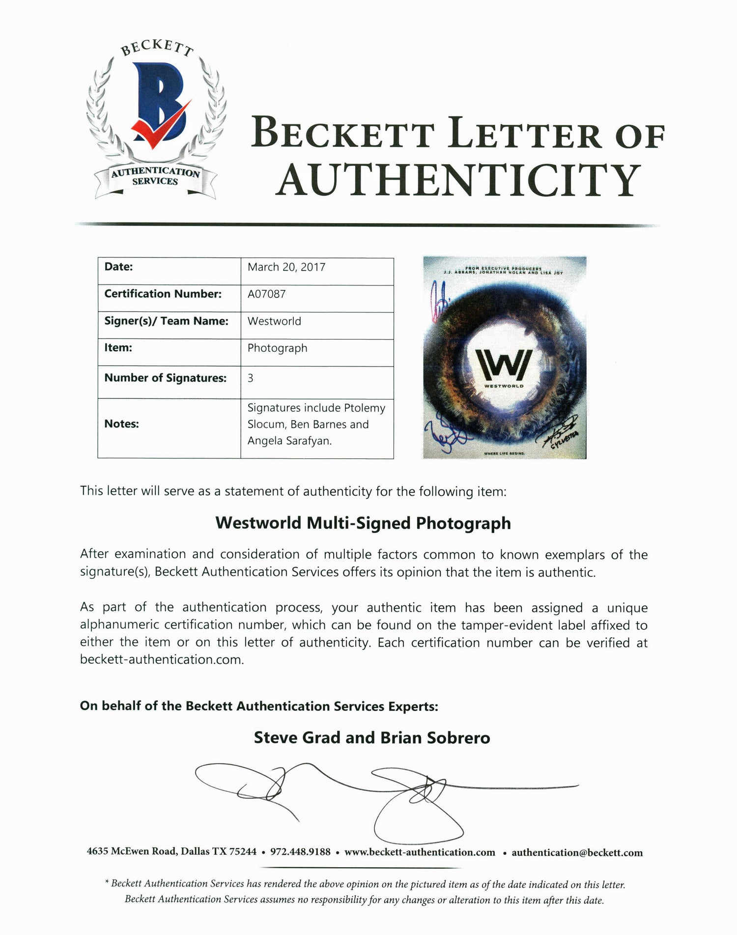 Westworld (Barnes, Sarafyan & Slocum) Authentic Signed 8X10 Photo BAS #A07087