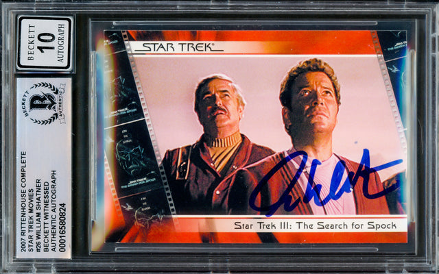 Own a piece of sci-fi history with this 2007 Rittenhouse Card #26, hand-signed by William Shatner, the legendary actor known for his iconic role as Captain James T. Kirk in Star Trek. This rare collectible has been graded Gem Mint 10 for its pristine signature by Beckett Authentication Services (BAS) and comes securely encapsulated in a tamper-proof holder for long-term preservation.
