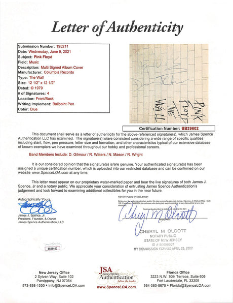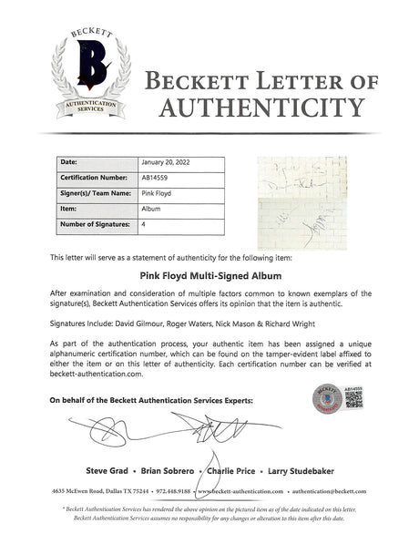 Pink Floyd (4) Gilmour, Waters, Mason & Wright Signed Album Cover JSA & BAS