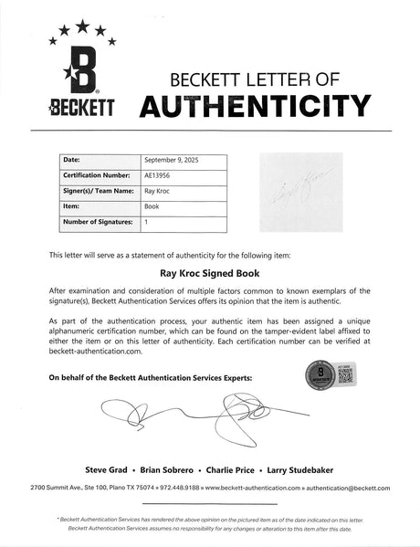 Ray Kroc Signed Grinding It Out: The Making of McDonald's Hard Cover Book BAS 2