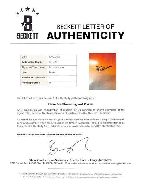 Dave Matthews Authentic Signed 24x36 Poster Auto Grade Gem Mint 10! BAS #AE16847