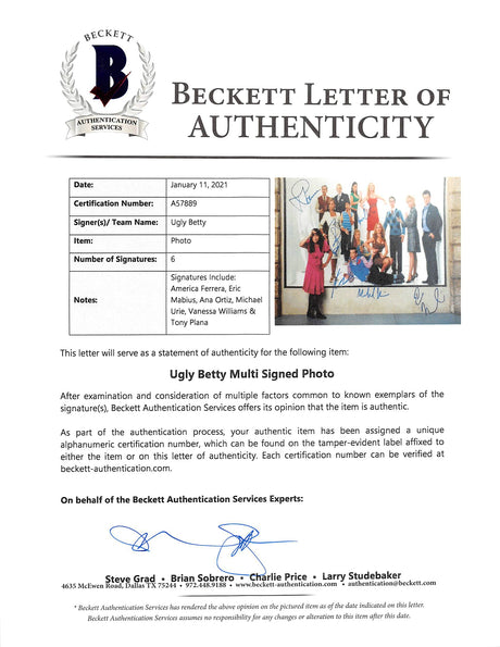 Ugly Betty (6) Ferrera, Mabius, Ortiz, Urie, +2 Signed 12x18 Photo BAS #A57889