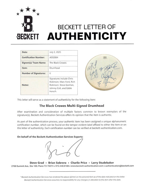 The Black Crowes (6) Robinson, Ford, Colt +3 Signed 13 Inch Remo Drum Head BAS