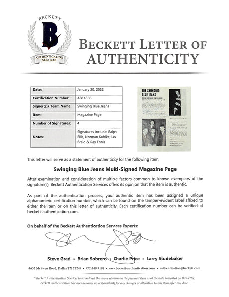 Very low stock (1 unit)$3,749Unit price /Unavailable Swinging Blue Jeans (4) Ellis, Kuhlke, Braid & Ennis Signed Magazine Page BAS