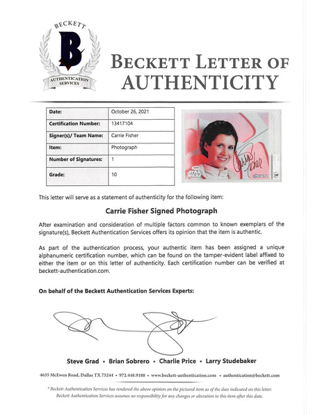 Carrie Fisher Star Wars Signed 8x10 Official Pix Photo Auto 10! BAS Slabbed