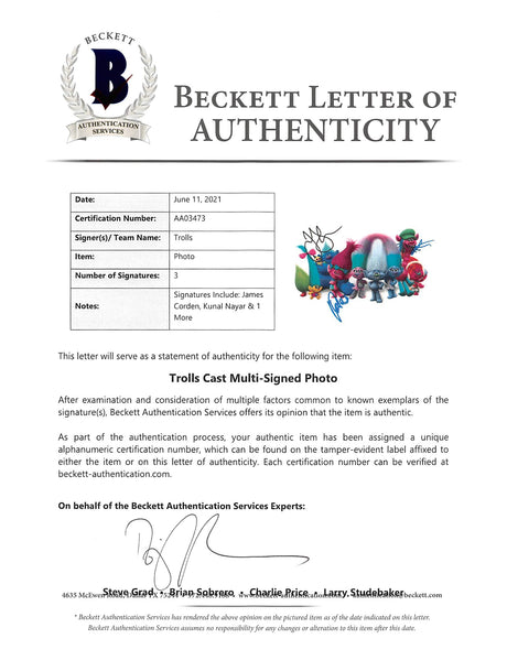 Trolls (3) James Corden, Kunal Nayar & 1 More Signed 11x14 Photo BAS #AA03473