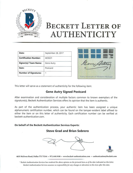 Gene Autry Authentic Signed & Framed 4.5x4.5 Postcard BAS #A03631