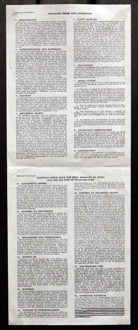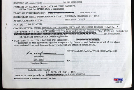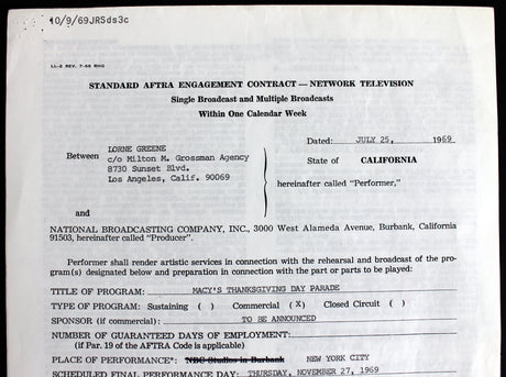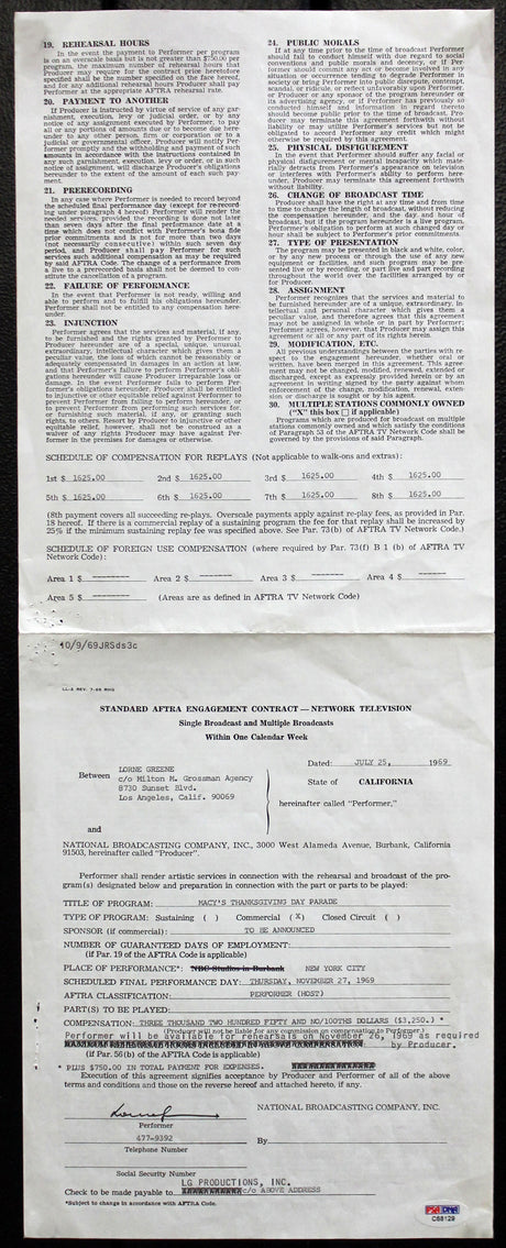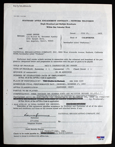 Lorne Greene Bonanza Signed Macy's Thanksgiving Day Parade Contract PSA #C68129