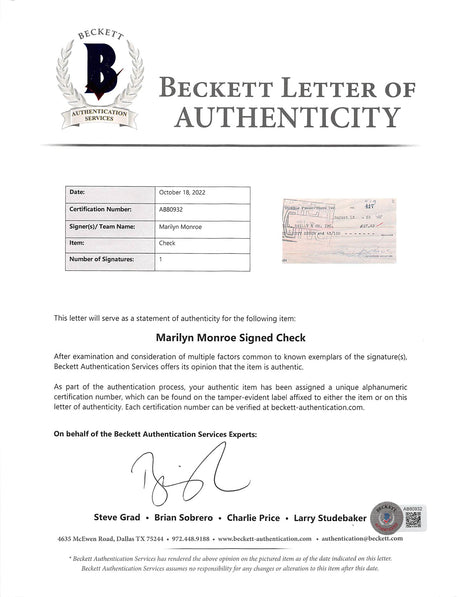 Marilyn Monroe Authentic Signed 3x8.5 1960 MM Productions Check BAS Slabbed