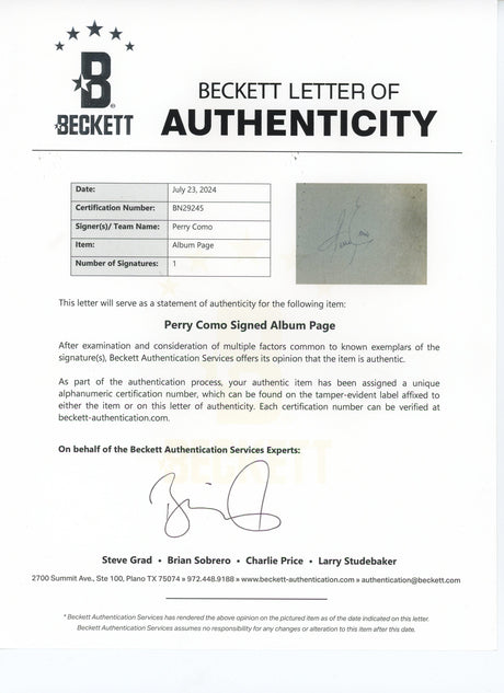 Perry Como Authentic Signed & Framed 2.5x3 Album Page Cut Signature BAS #BN29245