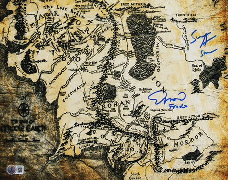 Elijah Wood & Sean Astin LOTR Signed 11x14 Middle Earth Map Photo BAS Witness 1