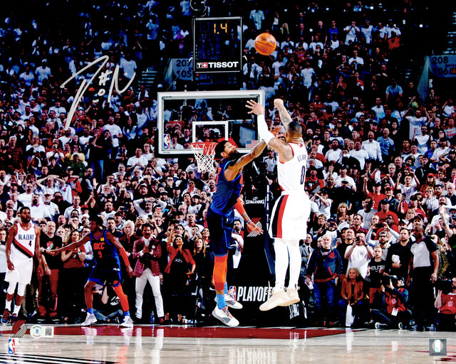 Own a piece of basketball history with this hand-signed Damian Lillard 16x20 photo, capturing one of the most iconic moments in NBA playoff history. This stunning image showcases Lillard's unforgettable game-winning three-pointer against Paul George and the Los Angeles Clippers, a shot that sealed victory in dramatic fashion.