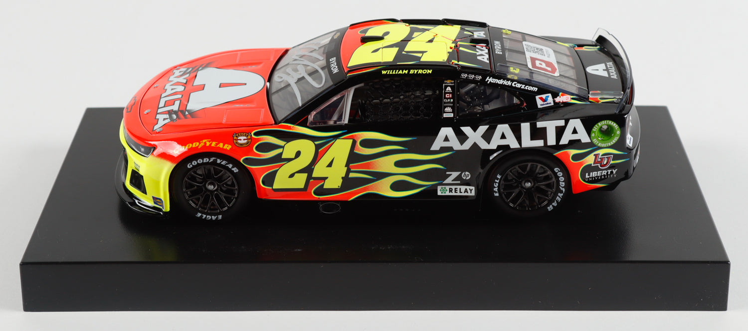 Collector-Grade, authenticated NASCAR autographed and signed memorabilia: William Byron 2024 #24 Axalta Throwback Camaro ZL1 1:24 diecast (limited to 636) with windshield signature. Byron is a rising force for Hendrick Motorsports—2017 NASCAR Xfinity Series Champion, 2018 Cup Series Rookie of the Year, and winner of the 2024 Daytona 500 in the iconic No. 24.