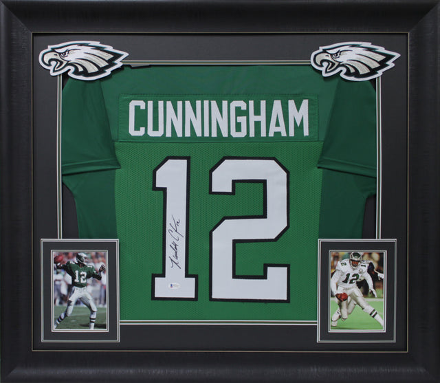 Own a piece of Philadelphia Eagles history with this Autographed Green Pro Style Framed Jersey personally signed by legendary quarterback Randall Cunningham. A true icon of the game, Cunningham's dynamic playstyle redefined the quarterback position, making this signed jersey a must-have for any devoted Eagles fan or serious memorabilia collector. This item is 100% Authentic, featuring a Certificate of Authenticity (COA) and hologram from Beckett Authentication Services (BAS). As part of the BAS Witnessed Protection Program, a Beckett representative was present during the signing, ensuring the authenticity of the signature. Product Details: