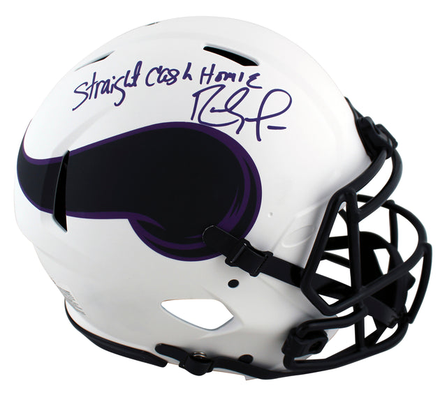 Own a piece of football history with this Randy Moss Autographed Alternate Lunar Riddell Authentic Full-Size Speed Proline Helmet, featuring the legendary inscription "Straight Cash Homie." A must-have for Minnesota Vikings fans and serious collectors, this stunning helmet is personally signed by one of the greatest wide receivers of all time.