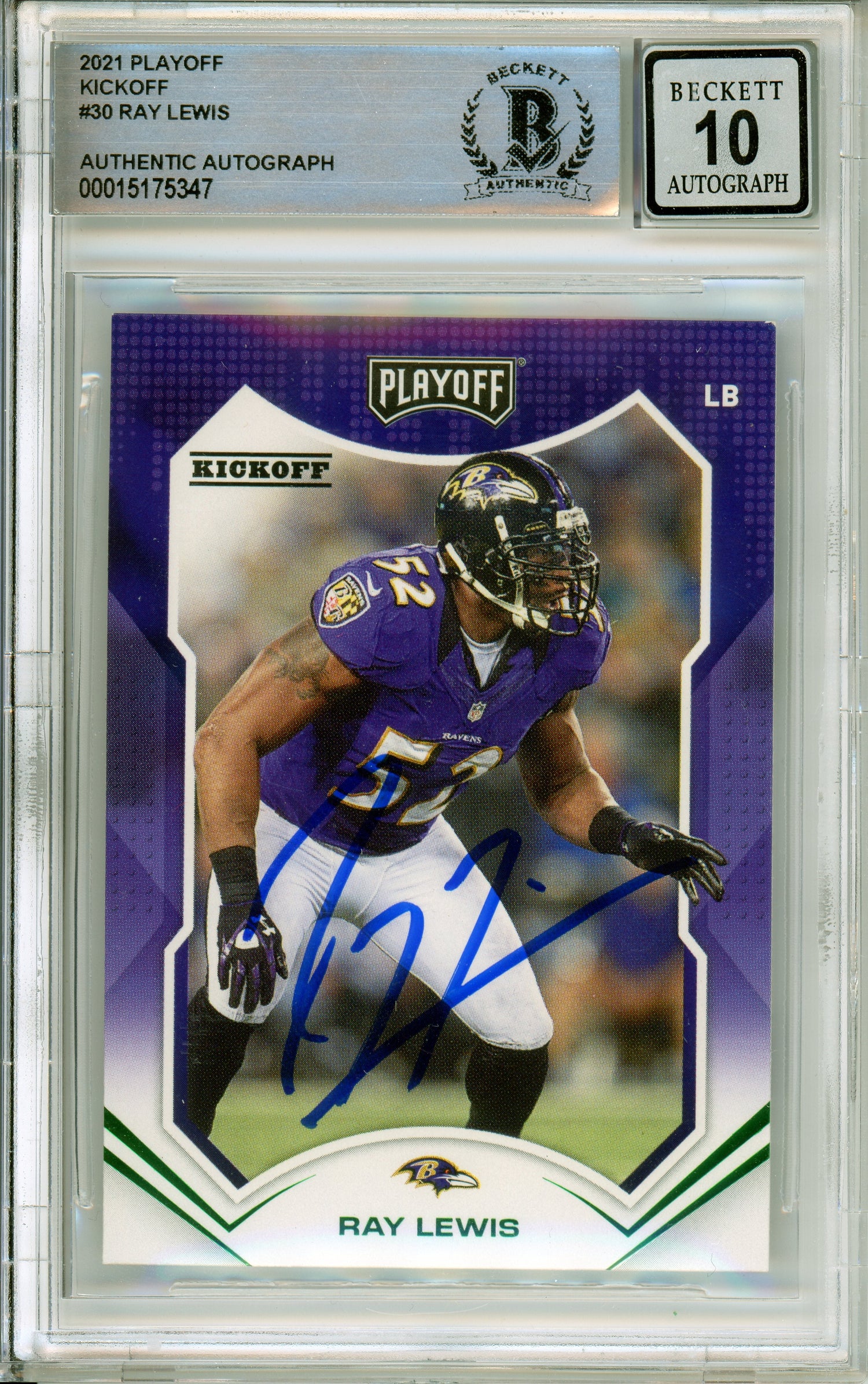Own a piece of football history with the 2021 Panini Playoff Kickoff #30 Ray Lewis Baltimore Ravens BAS Autograph 10 sports trading card. This rare collectible features a hand-signed autograph from legendary linebacker Ray Lewis, one of the most dominant defensive players in NFL history. Authenticated and graded by Beckett Grading Services (BGS) with a perfect Autograph 10 rating, this card is a must-have for serious collectors and Ravens fans alike.