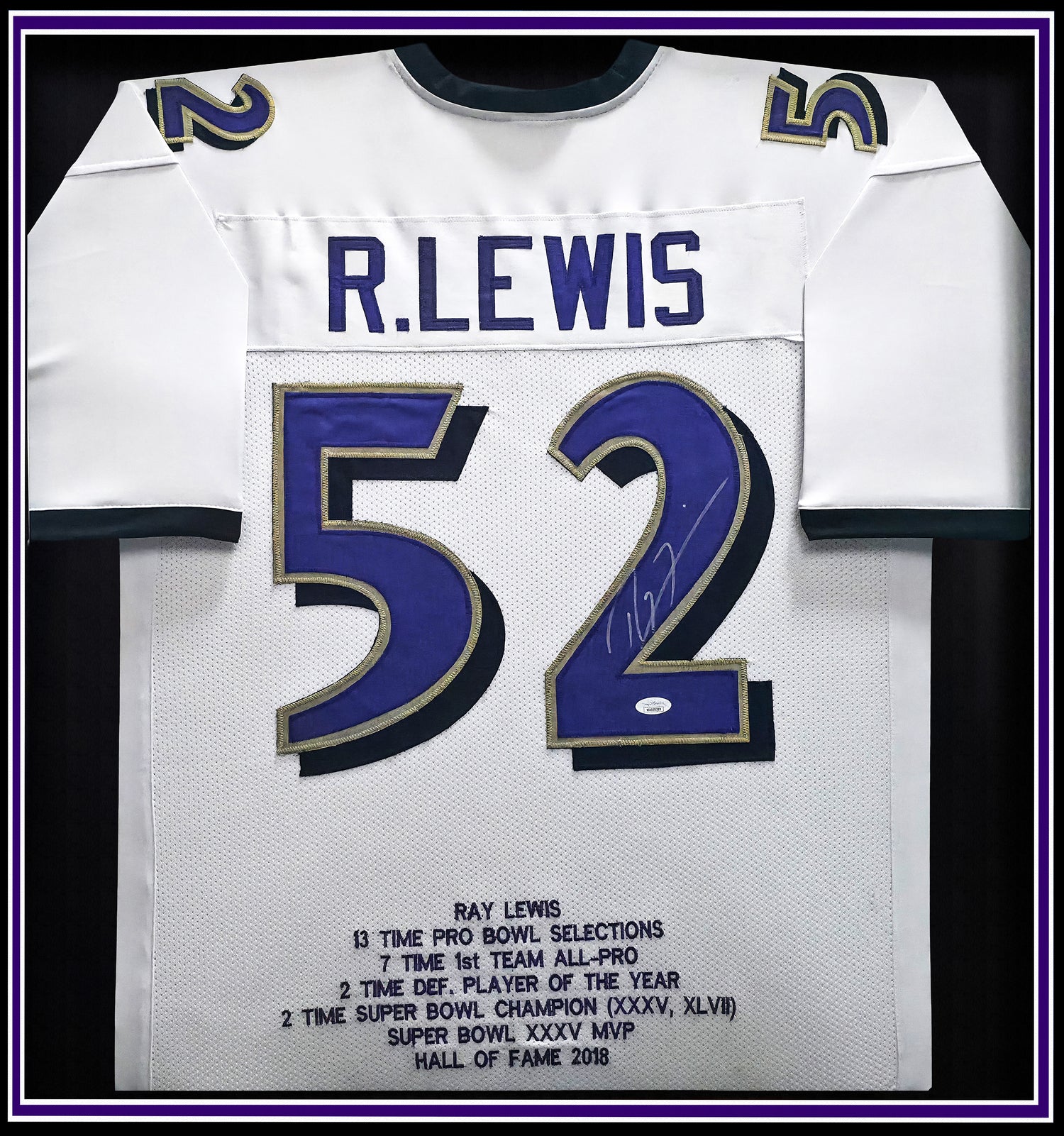 Celebrate the legacy of one of the NFL’s greatest linebackers with this stunning Ray Lewis Signed Framed White Jersey. A must-have for dedicated Baltimore Ravens fans and collectors of iconic NFL memorabilia, this piece honors a Hall of Fame career defined by passion, intensity, and championship glory. This custom white jersey, approximately 31x36 inches in its professional display frame, is hand-signed by Ray Lewis, a two-time Super Bowl Champion and the heart of the legendary Ravens defense. Though it is a non-branded replica jersey, it features XL sizing with beautifully sewn-in name and numbers, making it perfect for display in your fan cave, office, or memorabilia room.