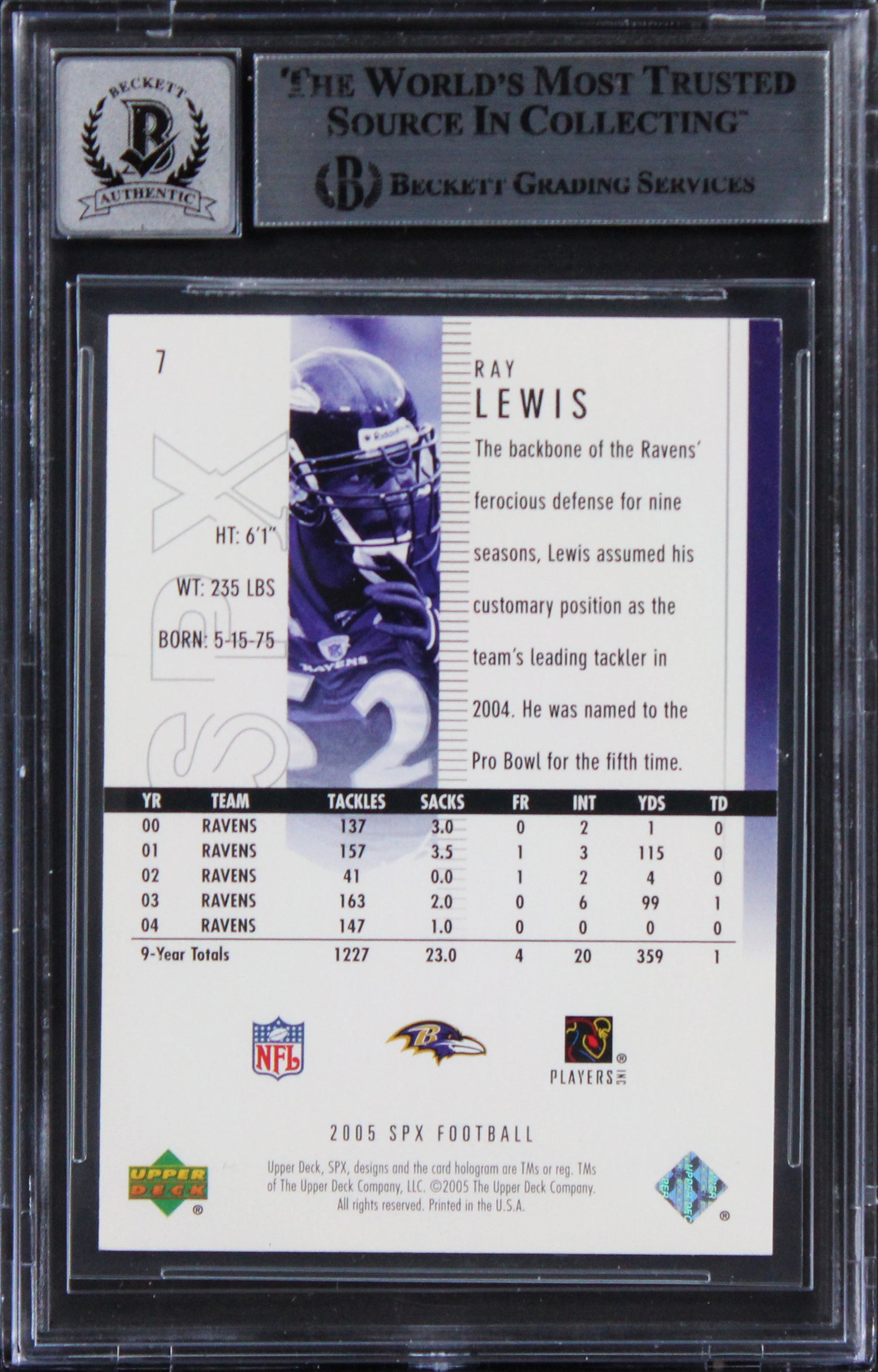 - Autographed 2005 SPX #7 Ray Lewis card — rare issue featuring the legendary Baltimore Ravens linebacker