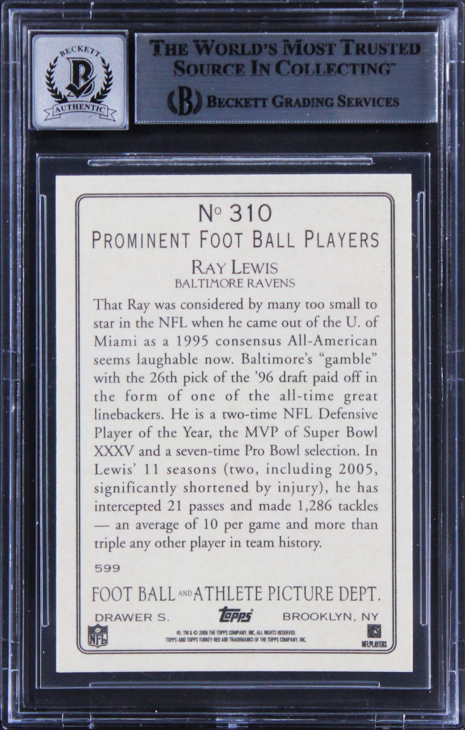 Own a piece of NFL history with this Ray Lewis Autographed Auto Graded Gem Mint 10! 2006 Topps Turkey Red #310 Card. This ultra-premium collectible features the personal signature of legendary Baltimore Ravens linebacker Ray Lewis—one of the most dominant defenders in NFL history and a two-time Super Bowl Champion. Captured in the distinctive 2006 Topps Turkey Red design, this card holds historic and visual appeal for serious collectors and Ravens fans alike. Slabbed and authenticated by Beckett Authentication Services (BAS), this gem is a verified authentic treasure worthy of any memorabilia collection. Ideal for fans who value both investment-grade memorabilia and deep football legacy, this item merges style with significance.