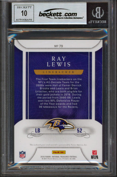 Ray Lewis Signed 2021 Panini National Treasures #17 #80/99 Card Auto 10 BAS Slab
