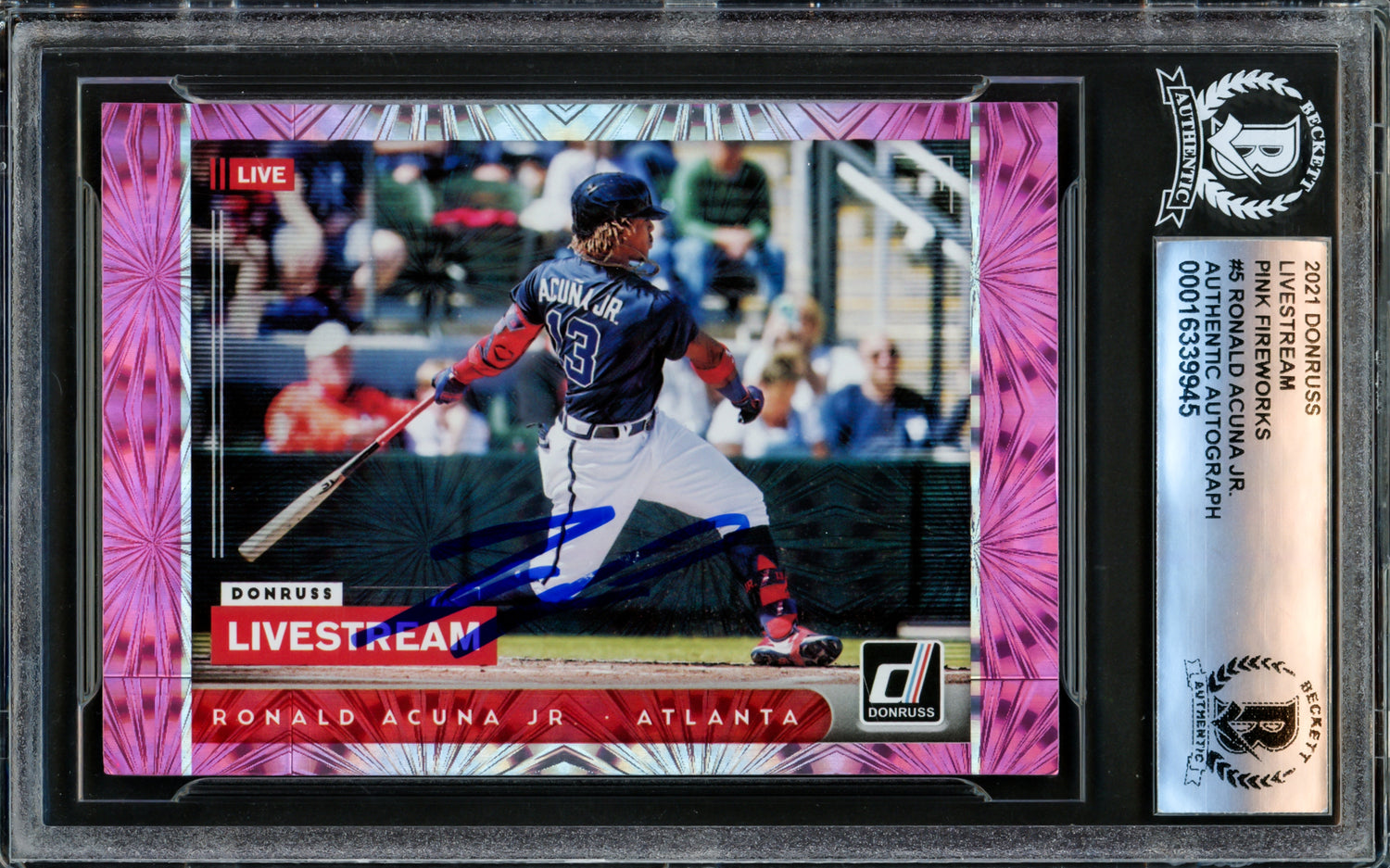 Ronald Acuna Jr. Autographed 2021 Donruss Livestream Pink Fireworks Card #LS5 Atlanta Braves Beckett BAS #16339945