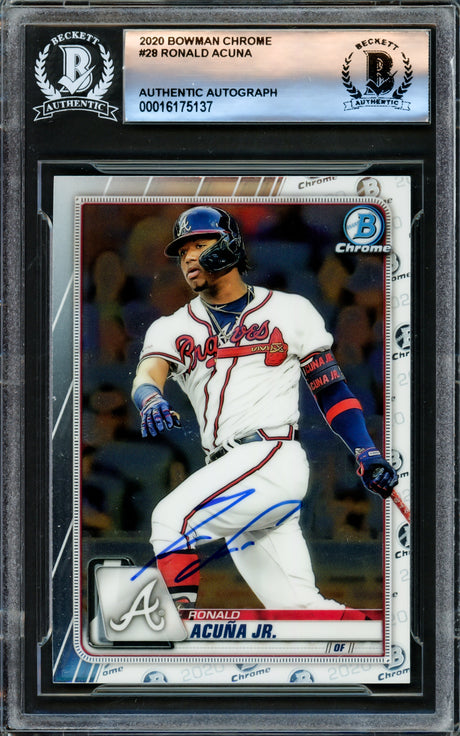 Very low stock (1 unit)$119Unit price /UnavailableRonald Acuna Jr. Autographed 2020 Bowman Chrome Card #28 Atlanta Braves Beckett BAS #16175137