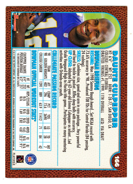 Daunte Culpepper Signed Minnesota Vikings 1999 Bowman Rookie Football Trading Card #166