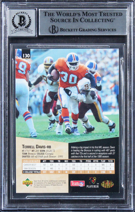 Very low stock (1 unit)$289Unit price /UnavailableBroncos Terrell Davis HOF 17 Signed 1995 SP #130 Rookie Card Auto 10 BAS Slabbed