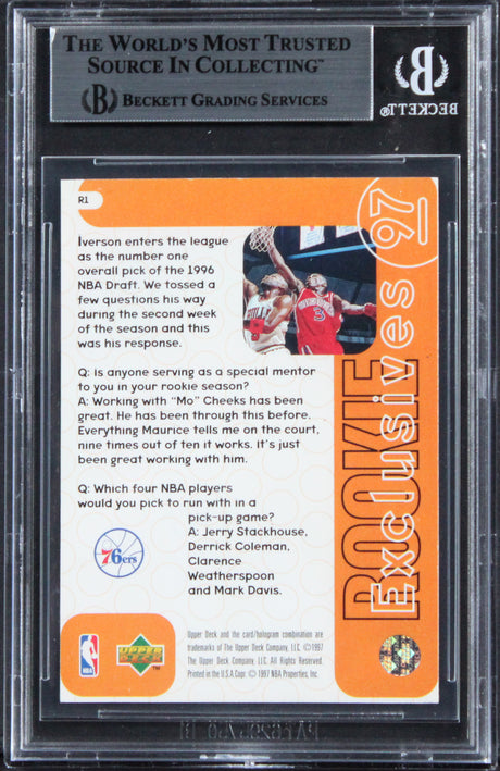 76ers Allen Iverson Signed 1996 Upper Deck Rookie Exclusive #R1 RC Card BAS Slab