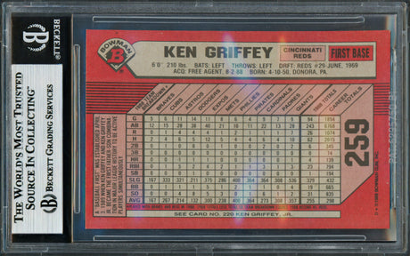 Very low stock (1 unit)$309Unit price /UnavailableKen Griffey Jr. & Sr. Autographed 1989 Bowman Rookie Card #259 Beckett BAS Stock #256405