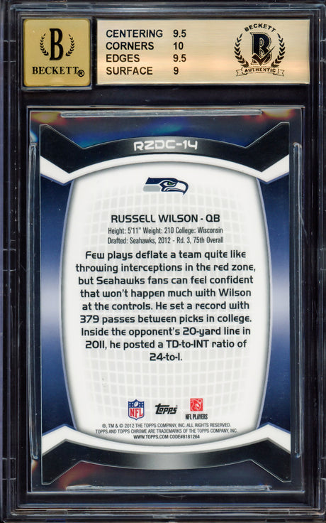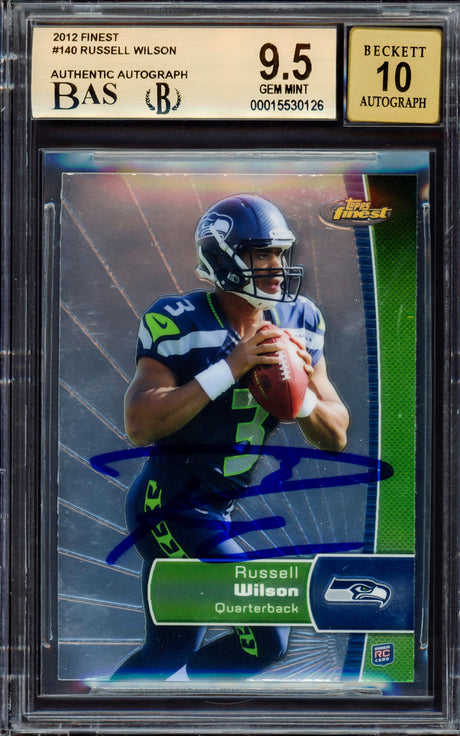 Collect a Russell Wilson signed trading card featuring one of the NFL's elite modern quarterbacks. Wilson's 2012 rookie cards launched alongside a historic season, and his autographed cards remain highly sought after. Every signed card from Pristine Marketplace is authenticated with a Certificate of Authenticity and tamper-evident hologram.