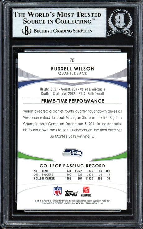 Very low stock (1 unit)$159Unit price /UnavailableRussell Wilson Autographed 2012 Topps Prime Rookie Card #78 Seattle Seahawks Beckett BAS #13447127