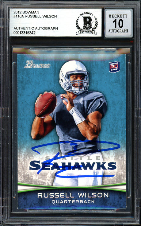 Collect a Russell Wilson signed trading card featuring one of the NFL's elite modern quarterbacks. Wilson's 2012 rookie cards launched alongside a historic season, and his autographed cards remain highly sought after. Every signed card from Pristine Marketplace is authenticated with a Certificate of Authenticity and tamper-evident hologram.