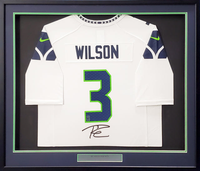 Verified Authentic, Collector-Grade autographed and signed memorabilia: a framed white Nike Seattle Seahawks jersey hand-signed by Russell Wilson and certified with his official RW player hologram and matching COA. A Super Bowl XLVIII Champion and 2020 Walter Payton NFL Man of the Year, Wilson led Seattle to sustained contention with multiple Pro Bowl selections. He is the Seahawks’ all-time leader in passing touchdowns and wins, solidifying his status as the franchise’s defining quarterback.