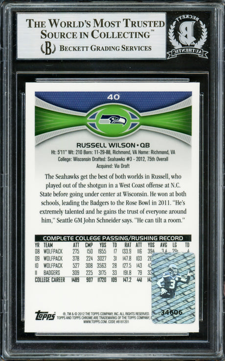 Russell Wilson Autographed 2012 Topps Chrome Rookie Card #40A Seattle Seahawks Beckett BAS #13020970