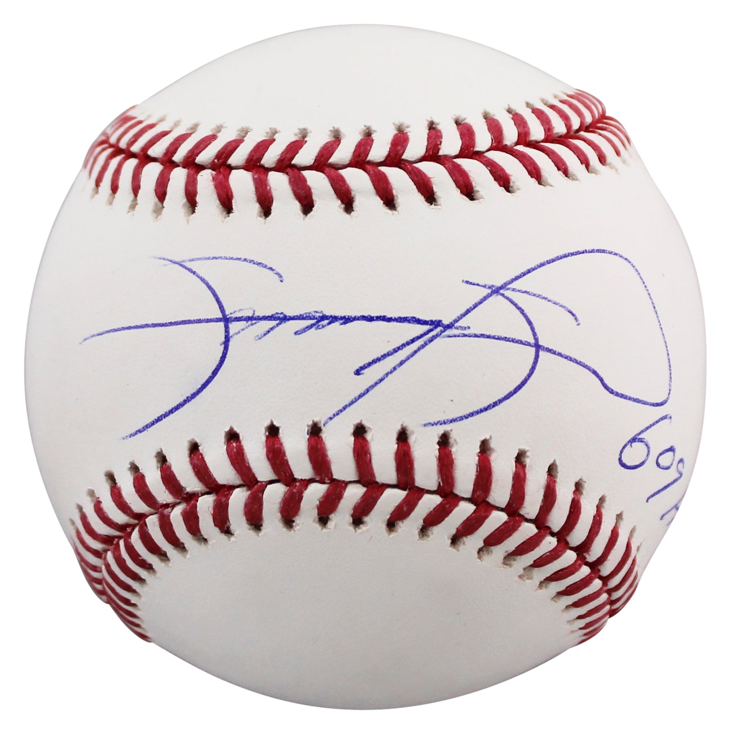 Own a piece of baseball history with this Sammy Sosa Autographed Robert Manfred Baseball inscribed with "609 HRS", celebrating his incredible 609 career home runs. This exclusive collectible is a must-have for Chicago Cubs fans and sports memorabilia collectors alike.