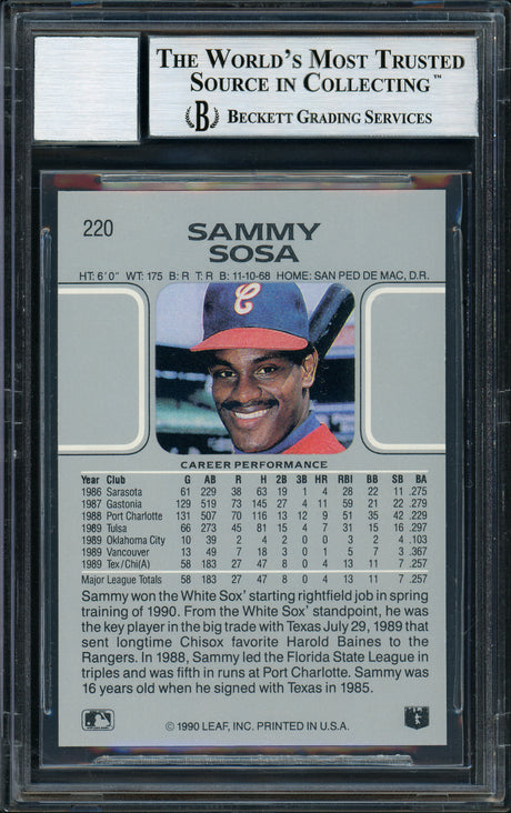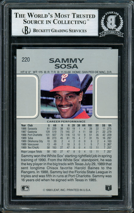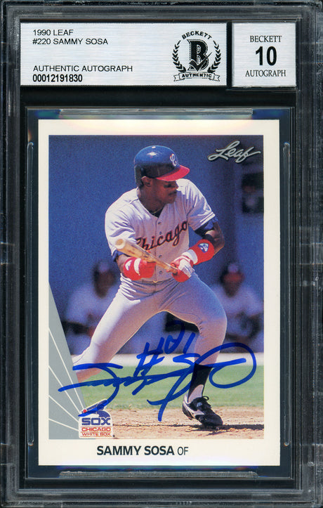 Sammy Sosa Autographed 1990 Leaf Rookie Card #220 Chicago White Sox Beckett BAS Stock #177672